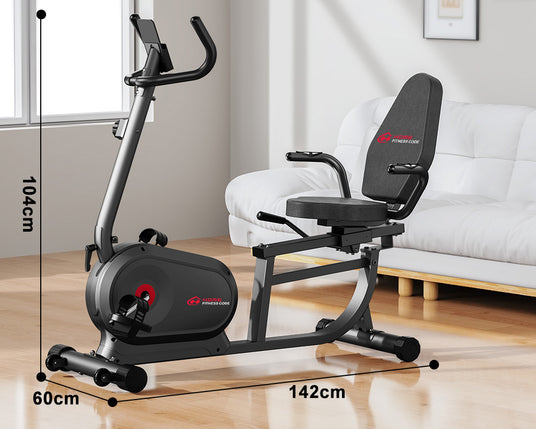 Dieses Liegefahrrad verfügt über einen Riemenantrieb mit manuell einstellbarem Magnetwiderstand und sorgt für ein sanftes und flüsterleises Trainingserlebnis.