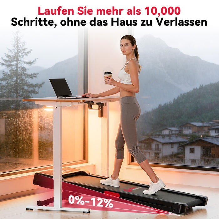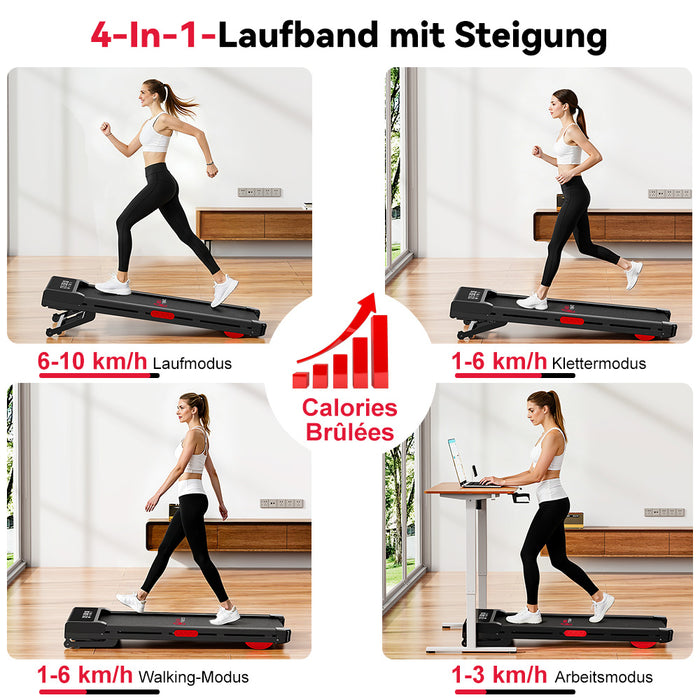 Das vielseitige 4-in-1-Laufband mit einem Geschwindigkeitsbereich von 1–10 km/h eignet sich ideal zum Arbeiten, Gehen, Bergsteigen und Laufen.